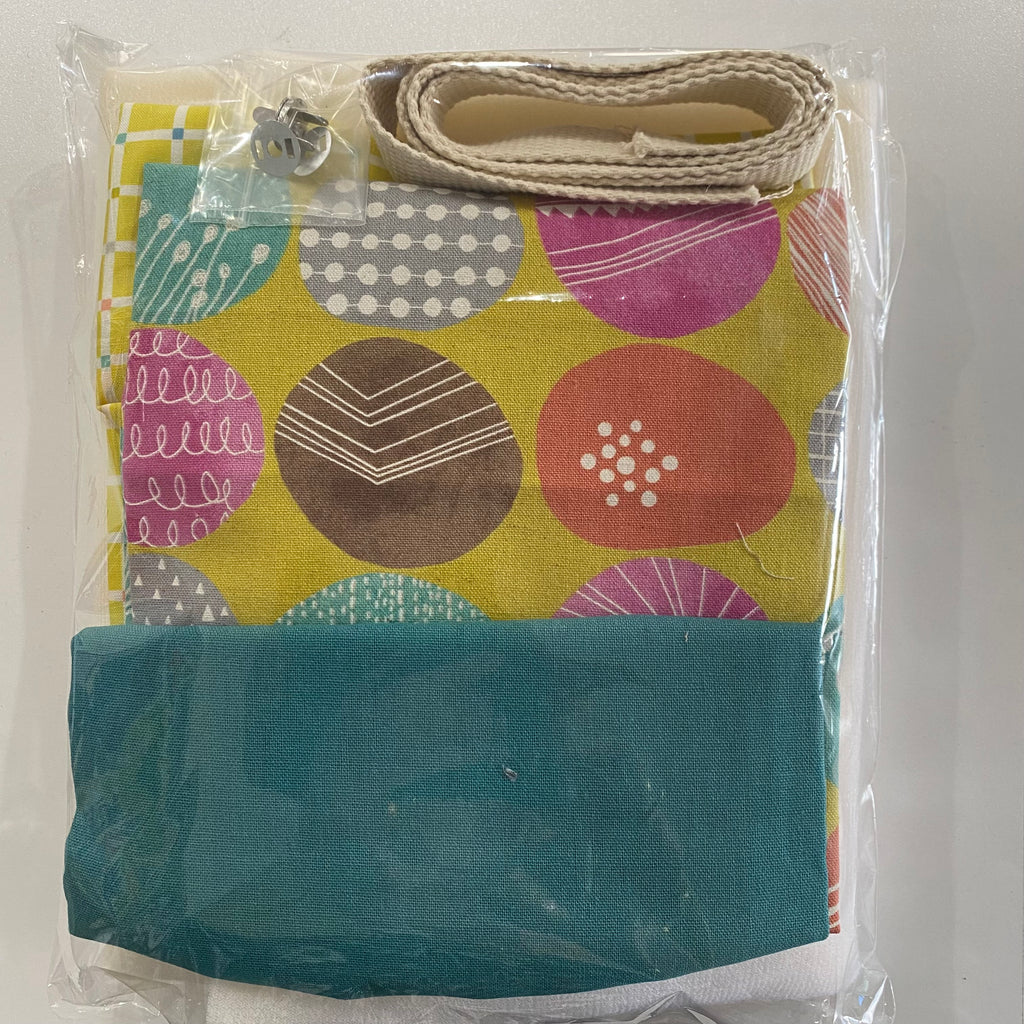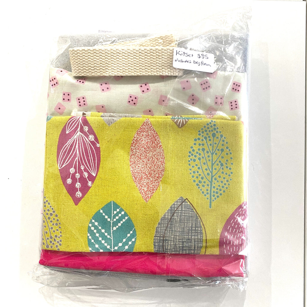 The kitset in different colour ways includes the pattern instructions, all fabrics (heavy cotton for main outer and quilting weight cottons for contrast and lining), fusible interfacing, bag foam, magnetic dome and firm cotton canvas webbing for handles.